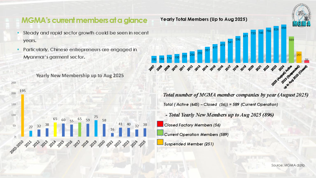 MGMA is the apex business association for the Myanmar garment sector. Our membership grew by 65 companies in 2014, most of our new members are foreign-invested garment manufacturers. As of September, 2019 MGMA membership included over 550 active member companies. In addition to operating more than 450 garment factories, our membership includes several design firms, commodities inspection companies, a few retail shops and a pattern-making training school.