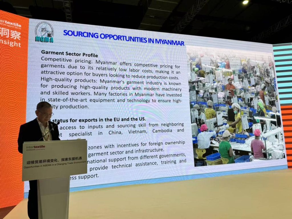 On September 2, Central Executive Committee of MGMA, U Kyin Tun attended opening ceremony of Intertextile Shanghai Autumn 2025 and VIP Welcome Tour and meeting with China National Textile & Apparel Council (CNTAC) Afterthat, U Kyin Tun participated AFTEX Forum, discussed the outline “Opportunities in ASEAN in Changing Trade Environment” and present about trade opportunities in Myanmar. Then, he also joined Intertextile Night VIP Dinner.