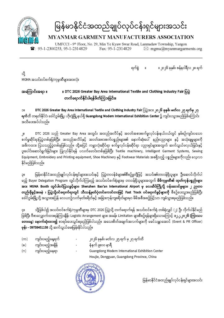 Flight ticket and other expenses will have to borne by participants. If you are interested to join, please register to Ms.Khin Thandar Aung (Event & PR officer), Phone: 09 758451158.