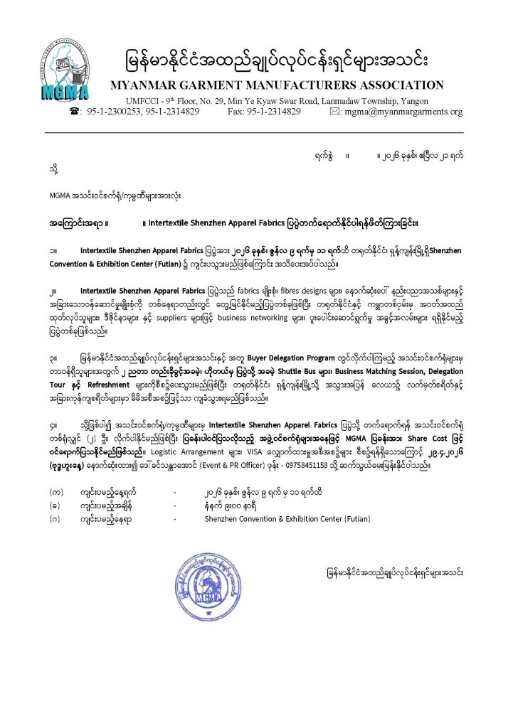 Flight ticket and other expenses will have to borne by participants. If you are interested to join, please register to Ms.Khin Thandar Aung (Event & PR officer), Phone: 09 758451158. In addition, member factories will have the opportunity to participate in showcasing “Made in Myanmar” products by exhibiting at the booth under a shared cost arrangement.