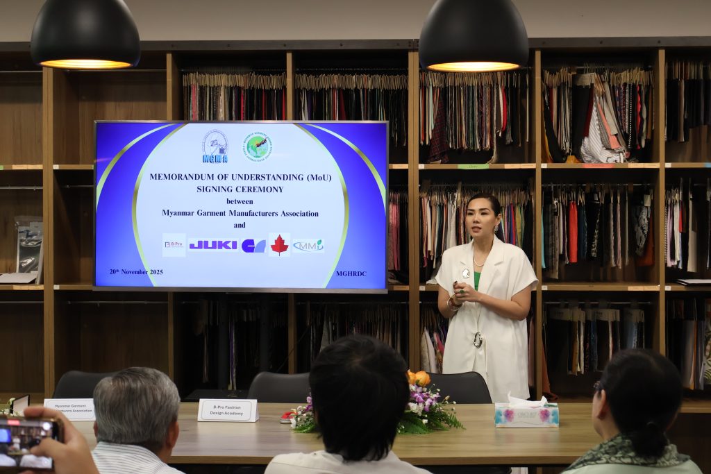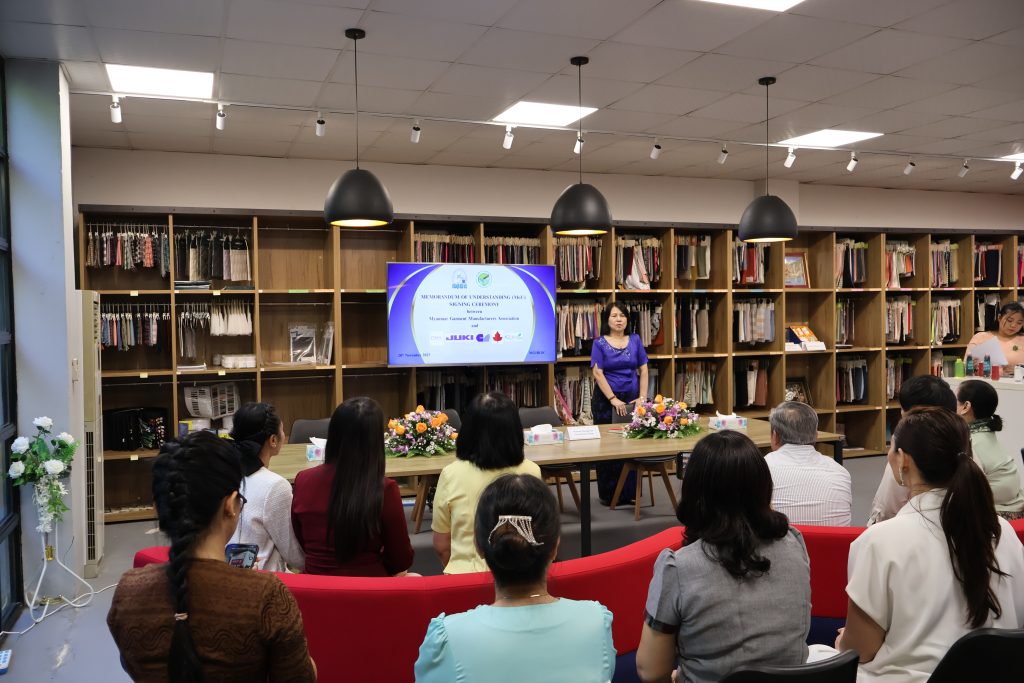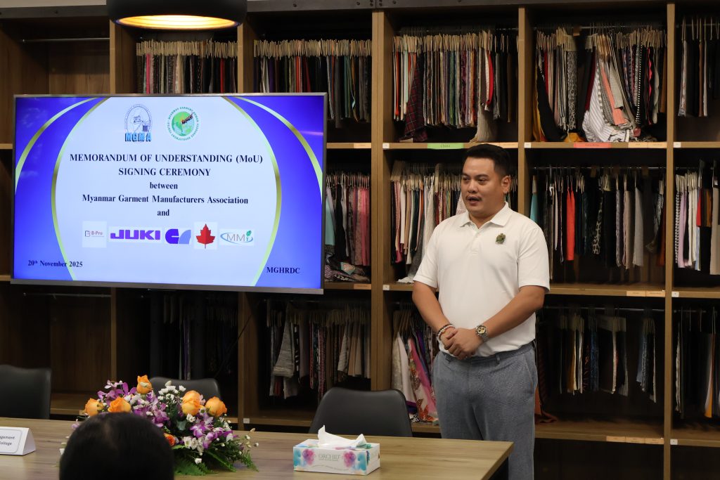 The ceremony began with opening remarks delivered by Daw Htay Htay Aye, Vice Chairman of MGMA, highlighted the importance of strengthening the garment sector through skills enhancement and job engagement. Daw Win Ei Khine , Executive committee member of MGMA presented the background of “Productivity & HRD working group activity” for Skill and capacity development in garment industry.